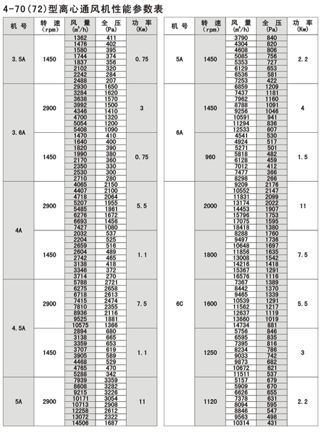 4-72型(xíng)不鏽鋼離心風機風量:930~154000m3/h,風壓170~2950Pa;4-79型通風機共20種機號,風量1100~438000 m3/h,風壓230~3320Pa,用戶(hù)可根據不同(tóng)參數選擇。