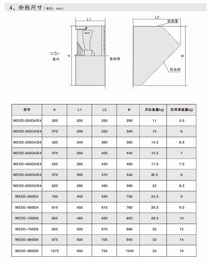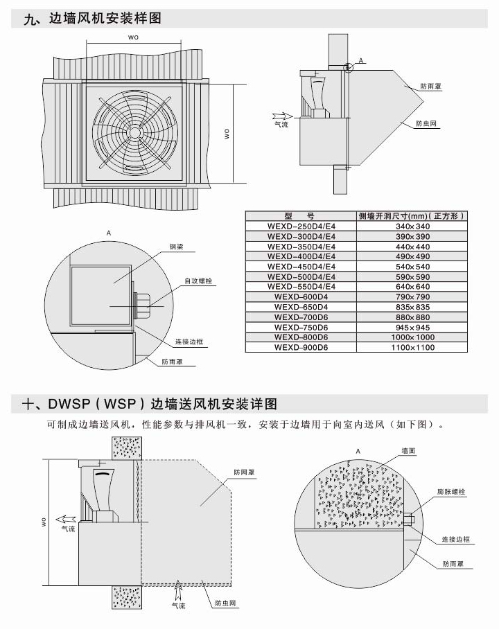 WSP不鏽鋼(gāng)邊牆送風機一般用於邊(biān)牆壁式排風,配設45°防雨(yǔ)罩(或特殊製造成60°)和防蟲網(夜間可防止(zhǐ)昆蟲循(xún)燈光飛入車間)。可(kě)按需要製成邊牆送風機型號為DWSP(WSP),配設90°防雨罩(防風、雨、塵)和防蟲網(夜間可防止昆蟲(chóng)循燈光飛入車間)。